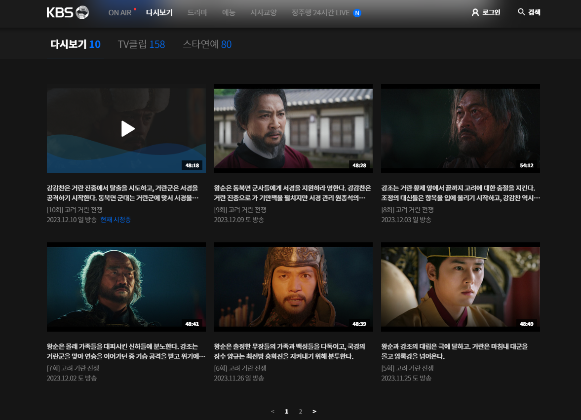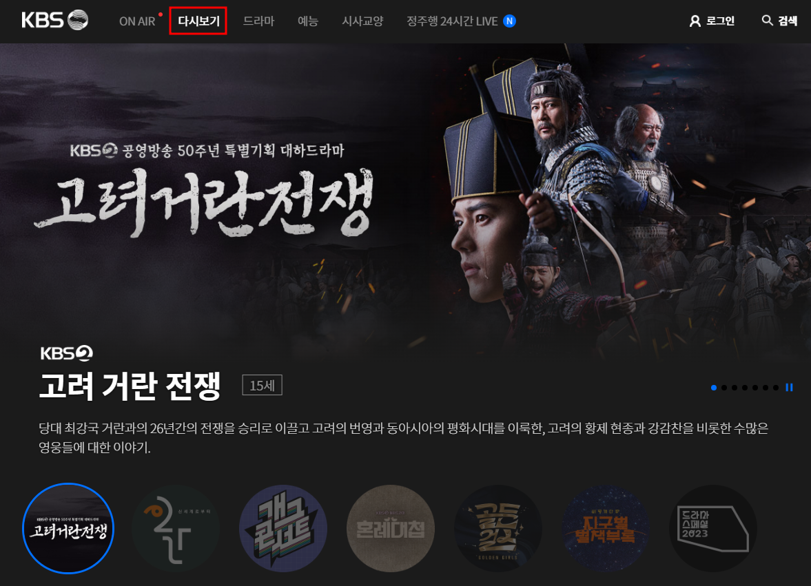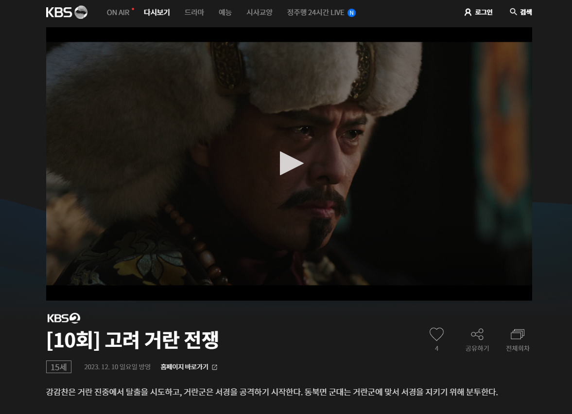 ▶ 현재 방영 중인 드라마 '고려 거란 전쟁' 을 KBS 온에어에서 '다시보기'를 클릭하셔서 바로 시청하실 수 있습니다. 바쁜 일상으로 노쳐버린 방송을 챙겨 보실 수 있습니다.