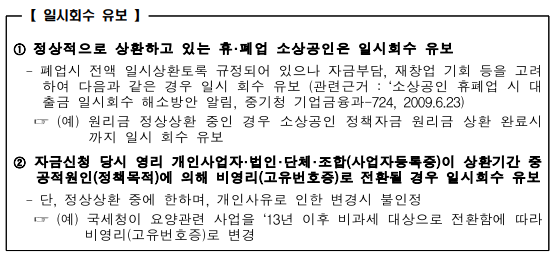 ⑤ 휴․폐업중인 소상공인. 단, 재해를 직접 원인으로 휴업중인 소상공인은 가동 중인 소상공인으로 간주하여 융자대상에 포함