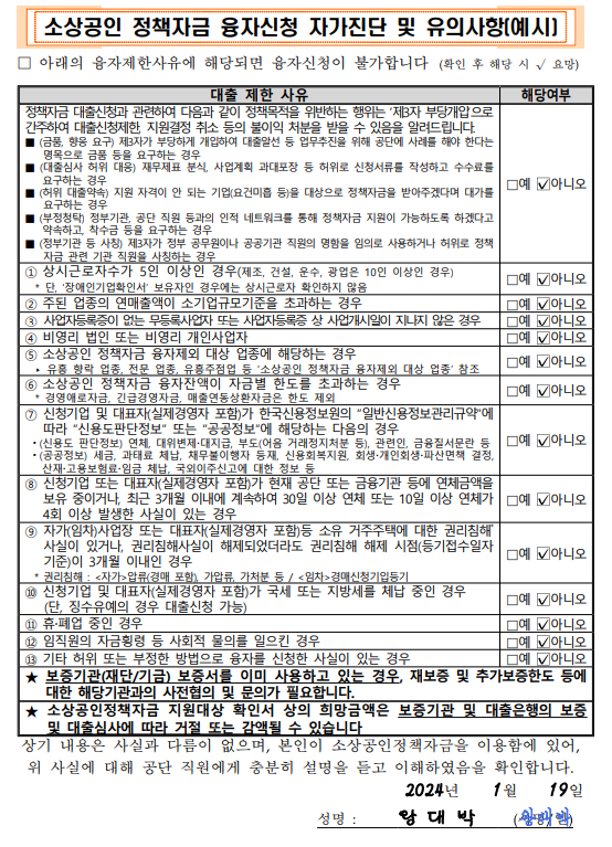 ✔️ 소상공인 정책 자금 융자 신청 자기진단 및 유의사항 작성방법
